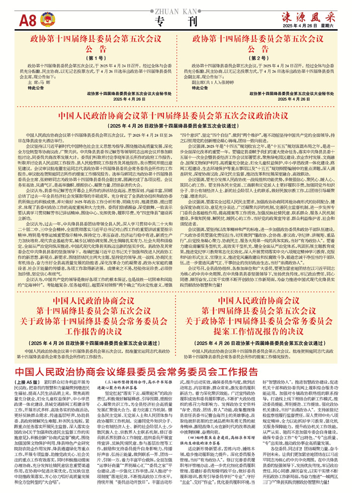 中国人民政治协商会议第十四届绛县委员会第五次会议政治决议与公告