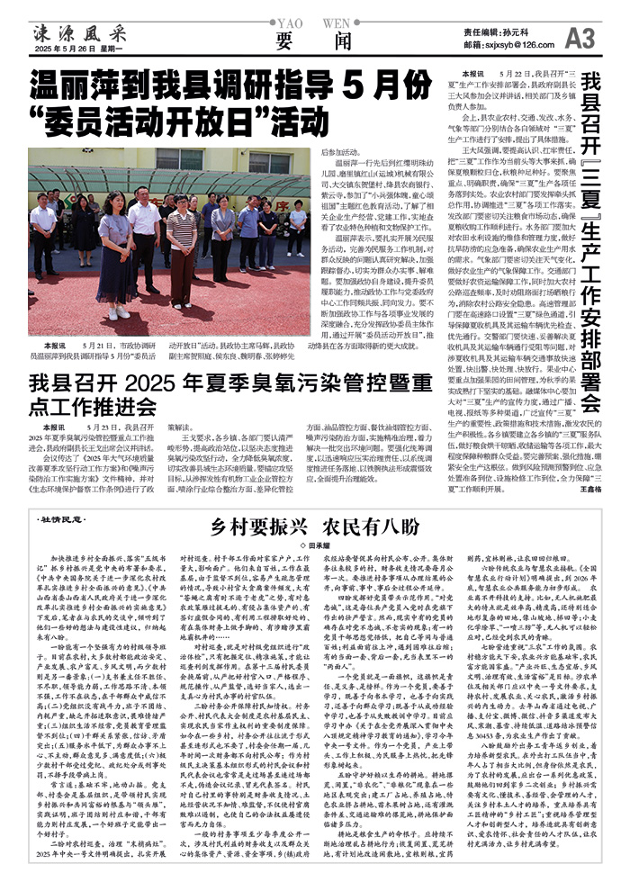 王大风强调,要提高认识、扛牢责任,把“三夏”工作作为当前头等大事来抓,确保夏粮颗粒归仓,秋粮种足种好。要聚焦重点、明确职责,确保“三夏”生产各项任务落到实处。农业农村部门要发挥牵头抓总作用,协调推进“三夏”各项工作落实。发改部门要密切关注粮食市场动态,确保夏粮收购工作顺利进行。水务部门要加大对农田水利设施的维修和管理力度,做好抗旱防涝的应急准备,确保农业生产用水的需求。气象部门要密切关注天气变化,做好农业生产的气象保障工作。交通部门要做好农资运输保障工作,同时加大农村公路巡查频率,及时劝阻路面打场晒粮行为,消除农村公路安全隐患。高速管理部门要在高速路口设置“三夏”绿色通道,引导保障夏收机具及其运输车辆优先检查、优先通行。交警部门要快速、妥善解决夏收机具及其运输车辆通行受阻等问题,对涉夏收机具及其运输车辆交通事故快速处置,快出警、快处理、快放行。果业中心要重点加强果园的田间管理,为秋季的果实成熟打下坚实的基础。融媒体中心要加大对“三夏”生产的宣传力度,通过广播、电视、报纸等多种渠道,广泛宣传“三夏”生产的重要性、政策措施和技术措施,激发农民的生产积极性。各乡镇要建立各乡镇的“三夏”服务队伍,做好粮食烘干晾晒、收储运输等各项工作,最大程度保障种粮群众受益。要完善预案、强化措施,绷紧安全生产这根弦。做到风险预测预警到位、应急处置准备到位、设施检修工作到位,全力保障“三夏”工作顺利开展。
