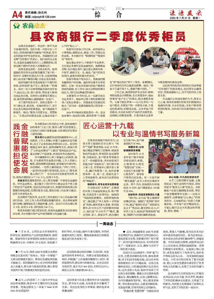 县农商银行二季度优秀柜员