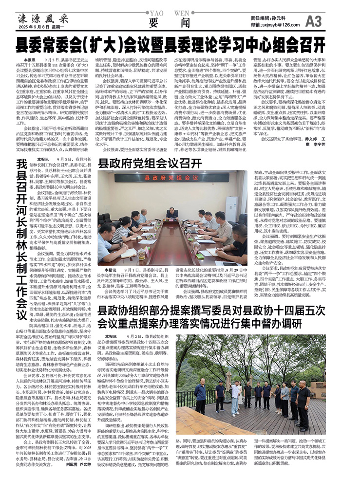 会议要求,各县级河长、林长要常态化深入包联的河流林区开展巡河巡林,持续传导压力。各乡级河长、林长要压紧压实村级河长林长、专职巡河员、护林员责任,做好日常巡查、隐患排查等基础工作。县水务局、林业局要充分发挥河长办和林长办牵头抓总、统筹协调、组织调度作用,确保各项任务落实落地。各成员单位要知责于心、担责于身、履责于行,强化部门协同和机制衔接,推动河长制、林长制工作从“有名有实”向“有能有效”深度转变,让故绛大地山更青、水更绿、景更美,为奋力谱写中国式现代化绛县新篇章提供坚实的生态支撑。