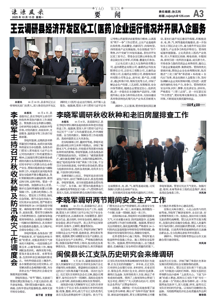 李晓军强调,各级各部门要严格按照省、市“抢收抢种保丰收”的要求,克服连阴雨天气带来的不利影响,一线指导群众开展玉米、山楂等秋收工作,精准调配各类农机,确保实现丰收。要备齐备足排水泵、水管等设备,在农田积水区域设临时排水点,为秋种创造适宜土壤条件。各乡镇要逐村走访受灾群众,切实解决群众急难愁盼问题,为全县农业生产和经济社会稳定发展提供坚实保障。