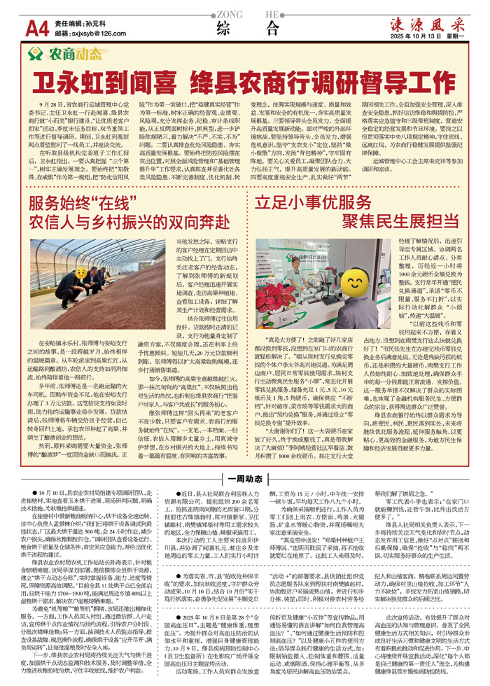 9月28日,省农商行运城管理中心党委书记、主任卫永虹一行赴闻喜、绛县农商行就“小而美”银行建设、“让优质老客户回家”活动、季度末任务目标、双节重保工作等进行督导调研。期间,卫永虹到基层网点看望慰问了一线员工,并座谈交流。