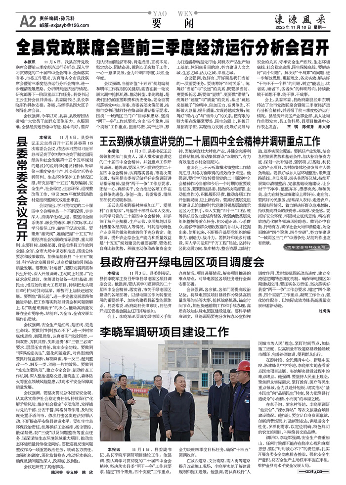 本报讯 11月6日,我县召开党政联席会暨前三季度经济运行分析会,深入学习贯彻党的二十届四中全会精神,全面落实省委、市委工作要求,认真落实全市党政联席会暨前三季度经济运行分析会精神,进一步理清发展思路,分析研判经济运行情况,研究部署下一阶段重点工作任务。县委书记王云主持会议并讲话。县委副书记、县长李晓军作具体安排。孙晓、马辉等县四大班子领导出席会议。
