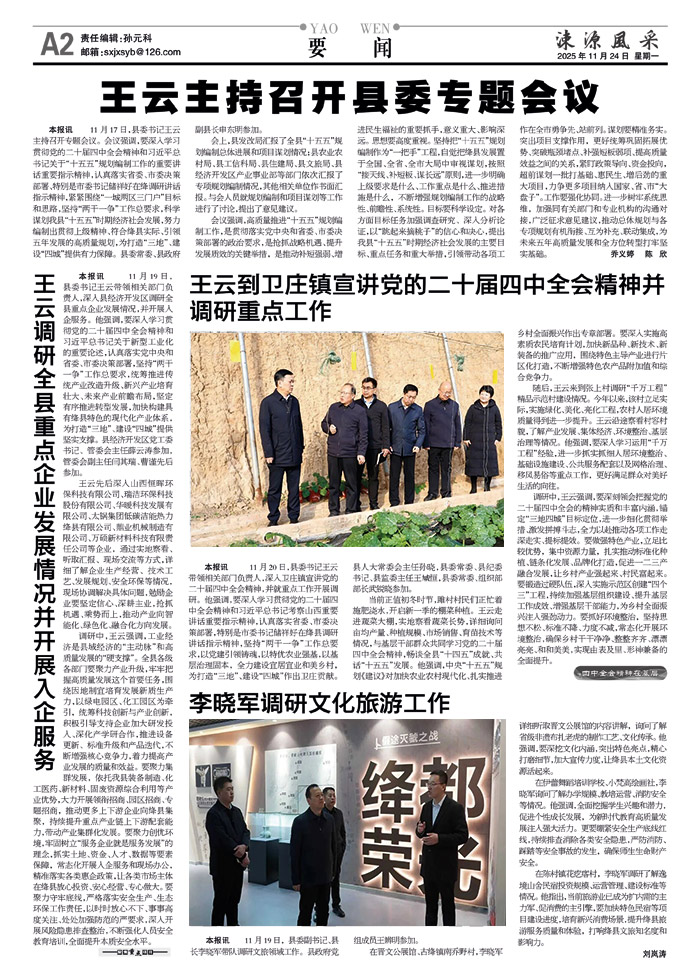 本报讯 11月17日,县委书记王云主持召开专题会议。会议强调,要深入学习贯彻党的二十届四中全会精神和习近平总书记关于“十五五”规划编制工作的重要讲话重要指示精神,认真落实省委、市委决策部署、特别是市委书记储祥好在绛调研讲话指示精神,紧紧围绕“一城两区三门户”目标和思路,坚持“两干一争”工作总要求,科学谋划我县“十五五”时期经济社会发展,努力编制出贯彻上级精神、符合绛县实际、引领五年发展的高质量规划,为打造“三地”、建设“四城”提供有力保障。县委常委、县政府副县长申东明参加。