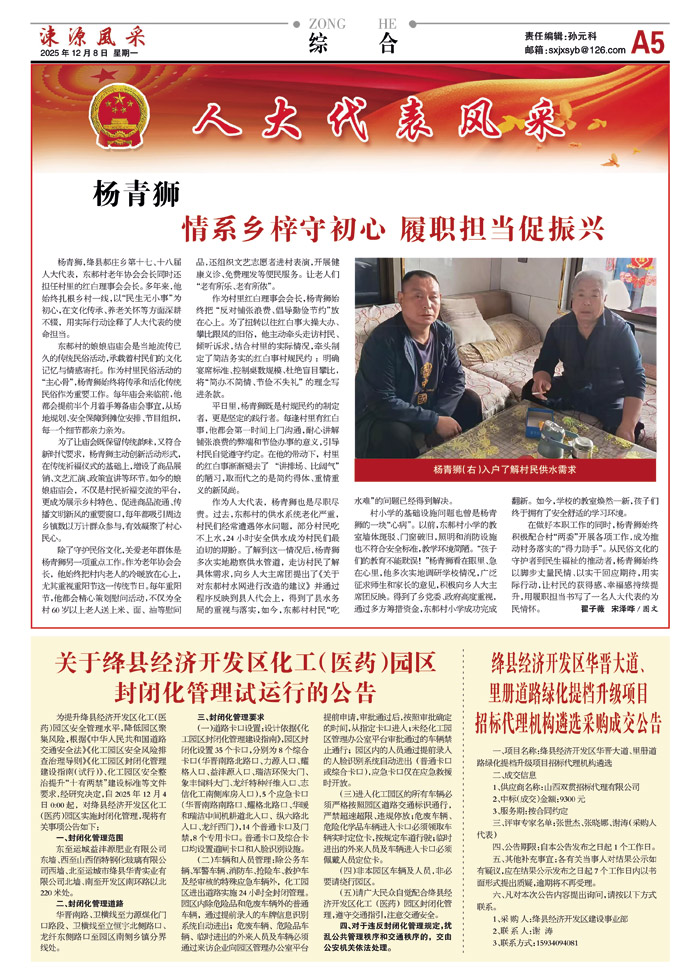 在做好本职工作的同时,杨青狮始终积极配合村“两委”开展各项工作,成为推动村务落实的“得力助手”。从民俗文化的守护者到民生福祉的推动者,杨青狮始终以脚步丈量民情、以实干回应期待,用实际行动,让村民的获得感、幸福感持续提升,用履职担当书写了一名人大代表的为民情怀。