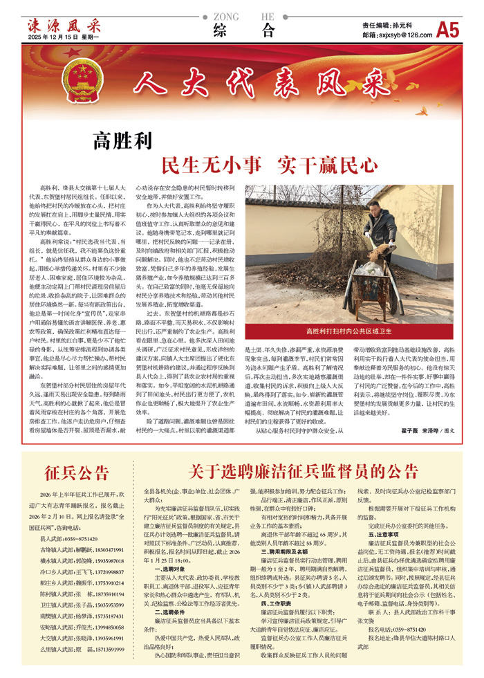 从贴心服务村民到守护群众安全,从带动增收致富到推动基础设施改善,高胜利用实干践行着人大代表的使命担当,用奉献诠释着为民服务的初心。他没有惊天动地的壮举,却在一件件实事、好事中赢得了村民的广泛赞誉。在今后的工作中,高胜利表示,将继续坚守岗位、履职尽责,为东贺堡村的发展贡献更多力量,让村民的生活越来越美好。