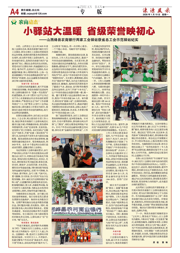 日前,山西省总工会公布2025年省级工会驿站名单,绛县农商银行城关支行工会驿站、桥东分理处工会驿站凭借规范的运作管理、优质的便民服务和深厚的民生情怀,成功获评省级工会驿站称号。这份荣誉的背后,是绛县农商银行践行“金融为民”初心、勇担社会责任的生动实践,更是对该行以驿站为桥、传递温暖的充分肯定。隆冬时节,走进该行工会驿站,热水氤氲的暖意、贴心周到的服务,让每一位前来歇脚的户外劳动者都能感受到“进门即回家”的温情,也让金融服务的暖流浸润古绛大地的街巷角落。