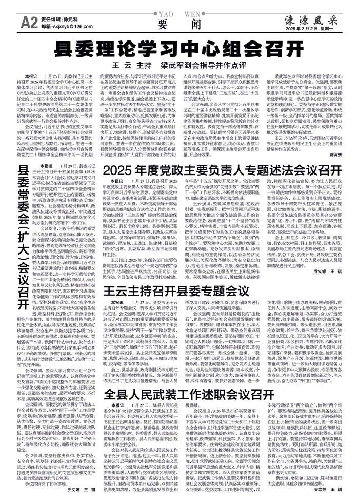 本报讯 1月29日,县委书记王云主持召开十五届县委第125次常委会(扩大)会议,传达学习贯彻习近平总书记在省部级主要领导干部学习贯彻党的二十届四中全会精神专题研讨班开班式上的重要讲话精神,听取省委巡视及专项检查反馈问题整改、社会稳定形势分析研判、政法队伍建设等情况汇报,审议通过《绛县2026年春节期间群众文化活动方案》,研究部署下一步工作。