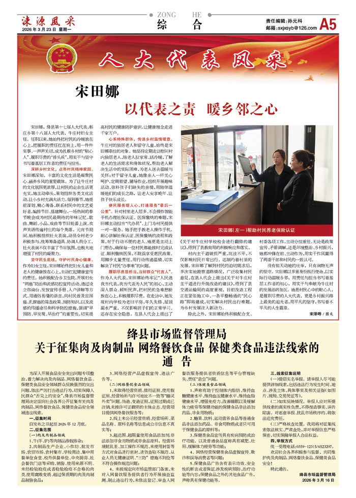 宋田娜,绛县第十七届人大代表,郝庄乡第十八届人大代表,牛庄村妇女主任。任职以来,她始终把村民的冷暖放在心上,把履职的责任扛在肩上,用一件件实事、一声声关切,成为扎根乡村的“贴心人”、履职尽责的“排头兵”,用实干与坚守书写着基层工作者的责任与担当。