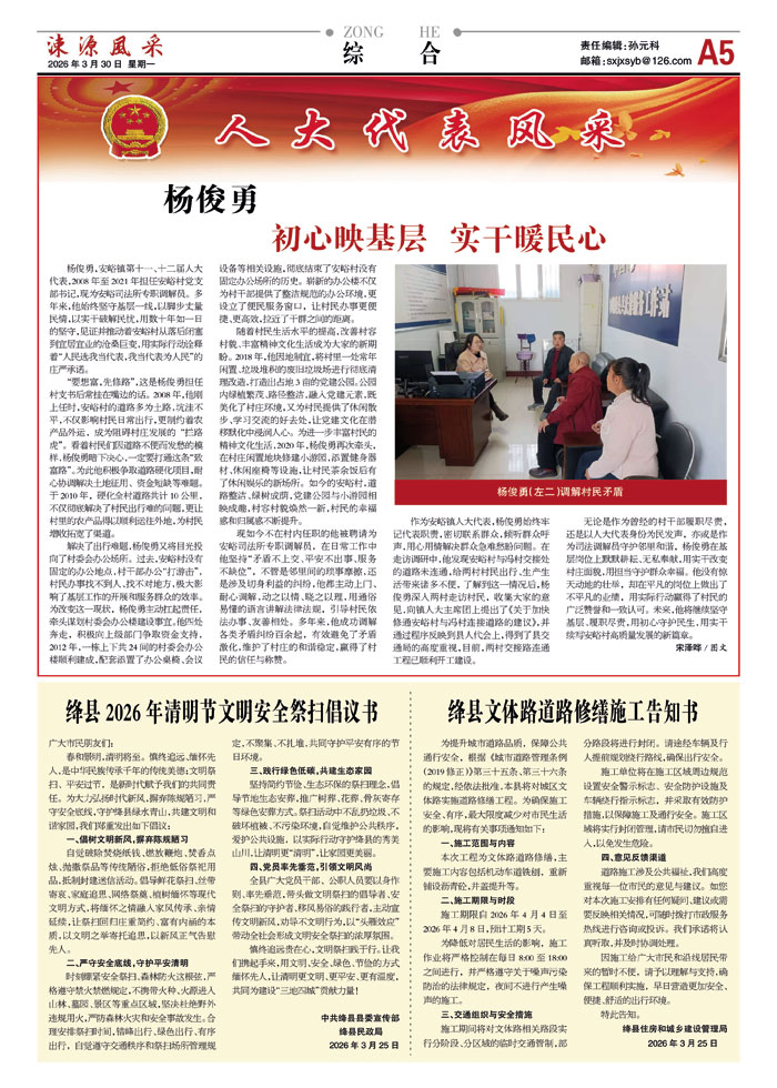 无论是作为曾经的村干部履职尽责,还是以人大代表身份为民发声,亦或是作为司法调解员守护邻里和谐,杨俊勇在基层岗位上默默耕耘、无私奉献,用实干改变村庄面貌,用担当守护群众幸福。他没有惊天动地的壮举,却在平凡的岗位上做出了不平凡的业绩,用实际行动赢得了村民的广泛赞誉和一致认可。未来,他将继续坚守基层、履职尽责,用初心守护民生,用实干续写安峪村高质量发展的新篇章。