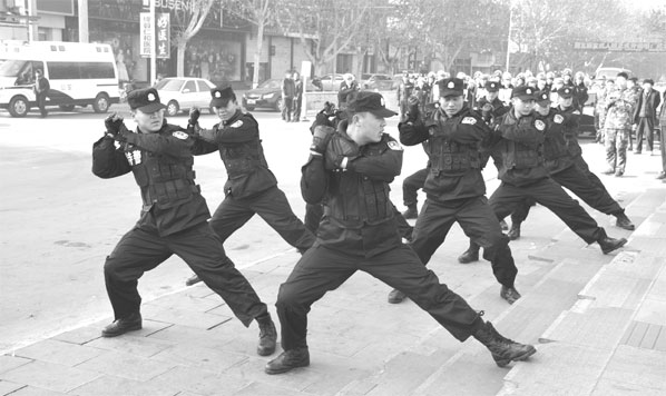 活动现场,县公安局巡特警大队的擒敌表演、防爆大队盾牌操表演赢得了现场群众的阵阵喝彩,参加活动的各警钟民警向周围群众发放了宣传资料。
