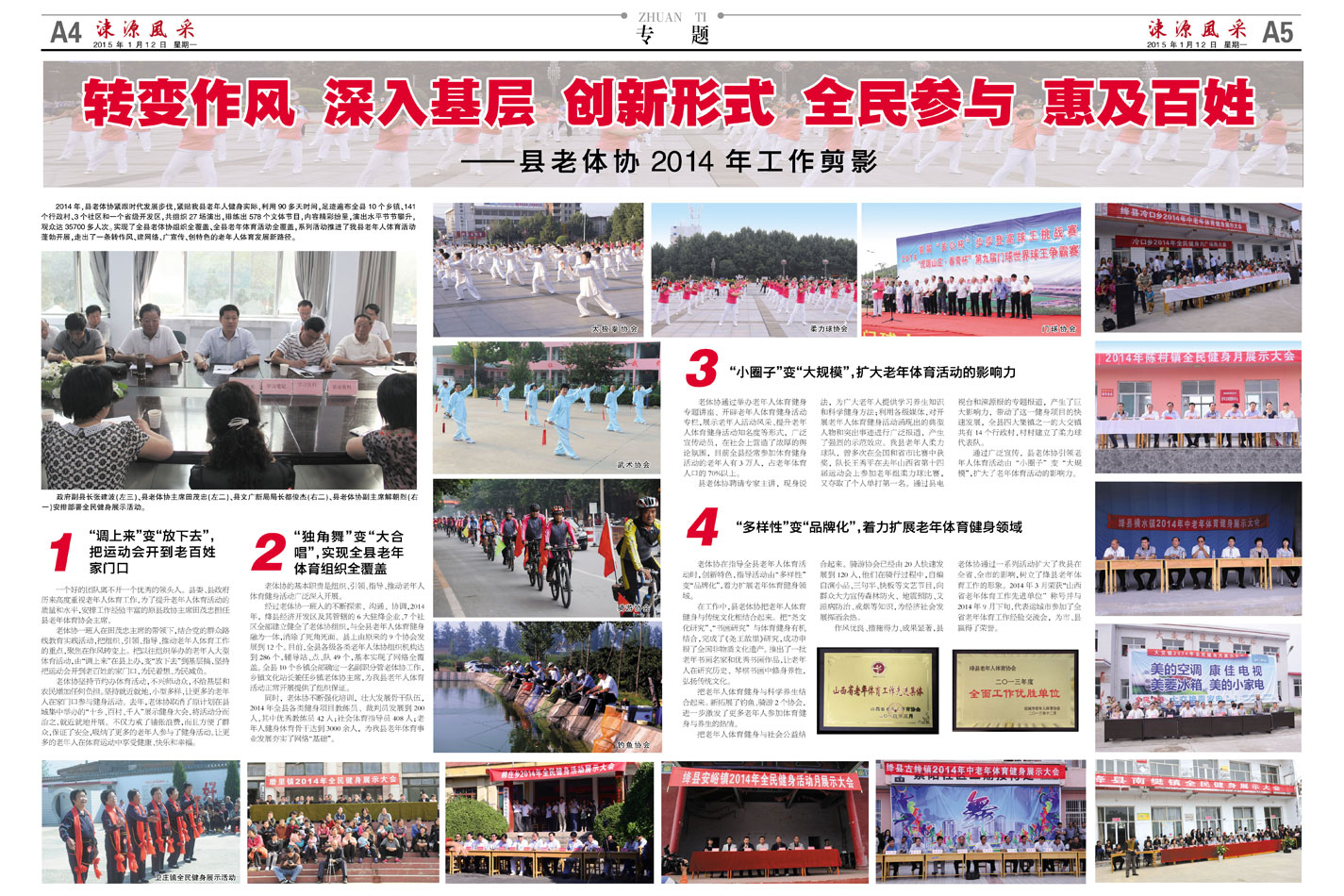 2014年,县老体协紧跟时代发展步伐,紧贴我县老年人健身实际,利用90多天时间,足迹遍布全县10个乡镇、141个行政村、3个社区和一个省级开发区,共组织27场演出,排练出578个文体节目,内容精彩纷呈,演出水平节节攀升,观众达35700多人次。实现了全县老体协组织全覆盖、全县老年体育活动全覆盖,系列活动推进了我县老年人体育活动蓬勃开展,走出了一条转作风、建网络、广宣传、创特色的老年人体育发展新路径。