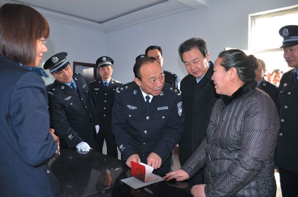 图为省公安厅党委委员、纪委书记周培斌在横水派出所与前来办理手续的群众进行交流,并就公安服务工作征求群众意见。 乔小飞 摄