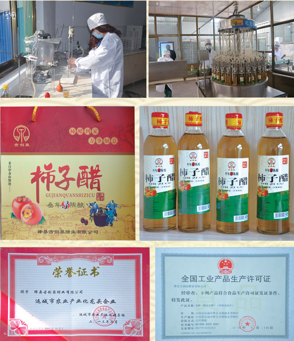 绛县古剑泉醋业有限公司地处中条山腹地,周围均系农田,环境优美、水源充足、水质上乘,交通便捷,并远离污染源。周围盛产柿子、山楂,更有野生酸枣及糖梨等山果,不施肥喷药,无公害,系纯天然绿色食品。企业拥有一大批高、中级技术人员,生产工艺采取传统酿造工艺和现代化检测手段相结合,在生产过程中不添加任何添加剂。产品经过严格的选料、清洗、破碎、野花、榨汁、发酵、精滤、灌装、封口、贮藏等流程,经检验合格后,方可进入市场。