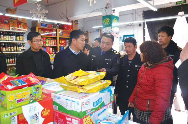 政府副县长张建波(左二)在福恒超市检查节前食品安全 康保平 摄