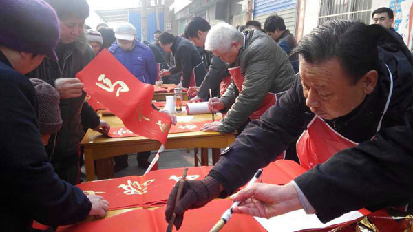 在磨里镇磨里村、陈村镇陈村的活动现场,10多名书法家们挥毫泼墨,为当地群众书写春联,尽管天气寒冷,但他们写的非常认真,有行书、篆书、隶书等字体,三个多小时,为群众书写了600多幅春联,把浓浓的年味儿和新春的祝福送到了群众的家门口,也表达了艺术家们对老百姓的浓浓深情。