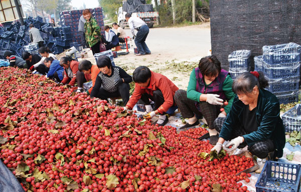 近年来,我县广大农村留守妇女积极投身“一村一品”实践,从事山楂、樱桃、草莓等特色农产品种植,成为带动群众致富的主力军,撑起了农村的半边天。图为收获季节,故绛镇北杨村的妇女采摘山楂。多年来,我县大力发展山楂种植,面积达到了10万亩,成为了全国最大的山楂基地县,带动生产销售等相关收入总产值达2亿元以上,小红果带领农户闯出了大市场。