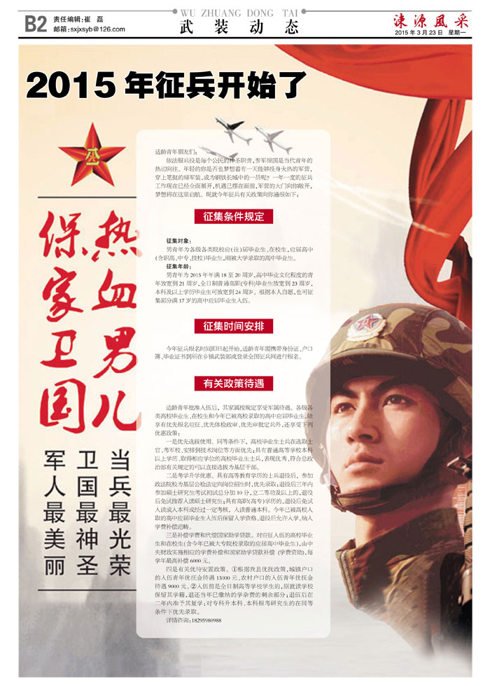 依法服兵役是每个公民的神圣职责,参军报国是当代青年的热切向往。年轻的你是否也梦想着有一天能够投身火热的军营,穿上笔挺的绿军装,成为钢铁长城中的一员呢?一年一度的征兵工作现在已经全面展开,机遇已摆在面前,军营的大门向你敞开,梦想将在这里启航。现就今年征兵有关政策向你通报如下: