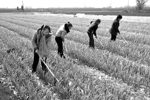 横水镇许家园村大蒜种植户付军录和邻里互助,对种植的大蒜进行管理。该村有着多年种植大蒜经验,目前大蒜种植户正在加紧除草、追肥、浇水,以促进大蒜多出蒜苔,多分瓣。