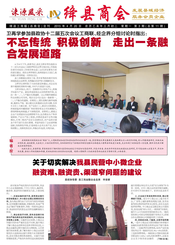 卫再学参加县政协十二届五次会议工商联、经企界分组讨论时指出:不忘传统 积极创新 走出一条融合发展道路