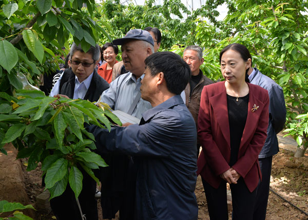 图为政府副县长李明爱陪同台湾专家一行在史村樱桃种植基地考察。