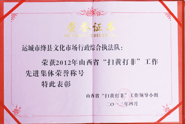 一份汗水,一份收获。县文化市场综合执法队荣获2012年度山西省"扫黄打非"工作先进集体、2013年度全国"扫黄打非"先进集体等称号。县文体广新局副局长、县文化市场综合执法队队长景冠军也荣获2011年度全省文化市场行政综合执法先进个人、2013年度山西省"扫黄打非"工作先进个人、2014年青年文明号创建20周年服务"美丽河东,大美运城"建设十佳个人称号。