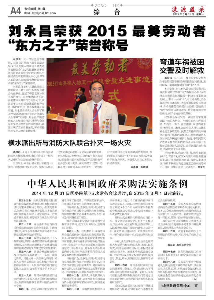 刘永昌荣获2015最美劳动者"东方之子"荣誉称号