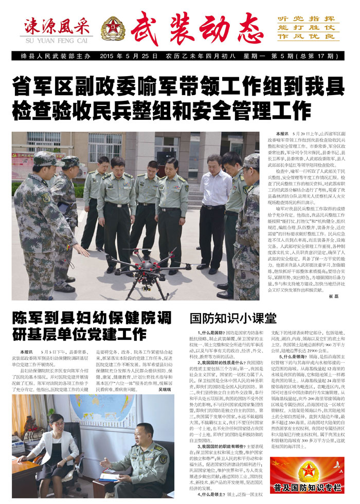 检查中,喻军一行听取了人武部关于民兵整组、安全管理等年度工作情况汇报。检查了民兵整组工作的相关资料,对武器库职工的轻武器分解结合进行了考核,观看了我县森林消防分队运用无人侦察机深入火灾现场勘查情况的科目演示。