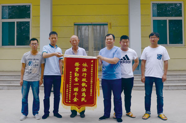 本报讯 6月12日,一面写着"依法行政执法为民,务实勤奋一诺千金"的锦旗和一封大红感谢信送到了县国土资源局横水中心所所长魏明智的手中。"是你们一次次不厌其烦地上门调解,终于化解了我和邻居间的宅基地纠纷,真是太感谢你们了!"横水镇坡底村69岁的老汉孙海生激动地说道。