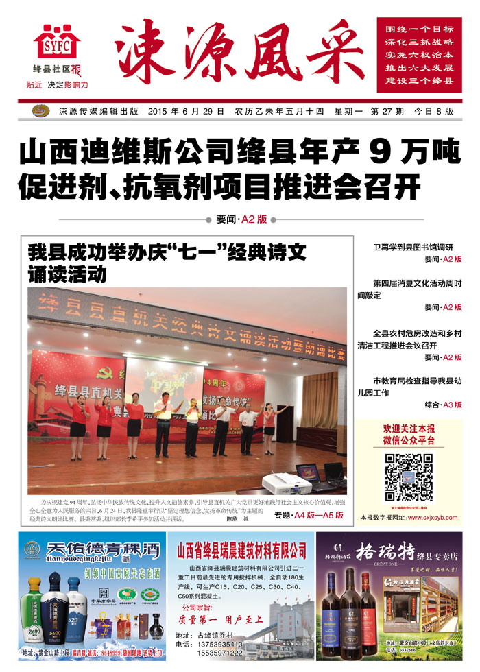 《涑源风采》绛县社区报 贴近,决定影响力 涑源传媒编辑出版 微信:suyuanfengcai 邮箱:sxjxsyb@126.com 电话:6523423