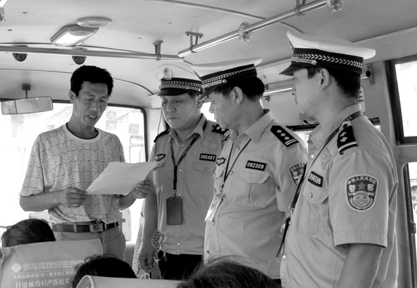 图为县公安局交警大队副书记何杰带领车管所民警对客车驾驶人进行面对面安全承诺。