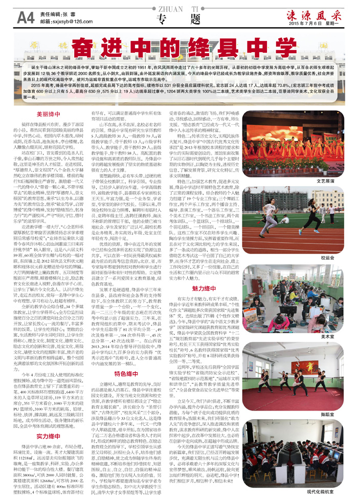 特色三:加强艺术教育,促进多元发展。绛县中学适时开展特色艺术教育,除了正常的课程安排,结合教师的个人魅力组建了19个专业工作室:三个舞蹈工作室,两个声乐工作室,两个播音主持、编导、表演工作室,一个器乐工作室,三个美术工作室,一个书法工作室,两个高考体训队,一个篮球队,一个排球队,一个羽毛球队,一个田径队,一个健美操队。这些工作室不仅在培养学生兴趣、陶冶学生情操方面,发挥着重要作用,而且在对于文化课比较吃力的学生来说,多了一条成功的道路,相当一部分学生借助艺术考试这一平台圆了自己的大学梦。而身怀才艺的学生在走向社会、踏上工作岗位时,又多了一份技能,在自己的生活和工作圈内显示出与众不同的超常实力和个人魅力。