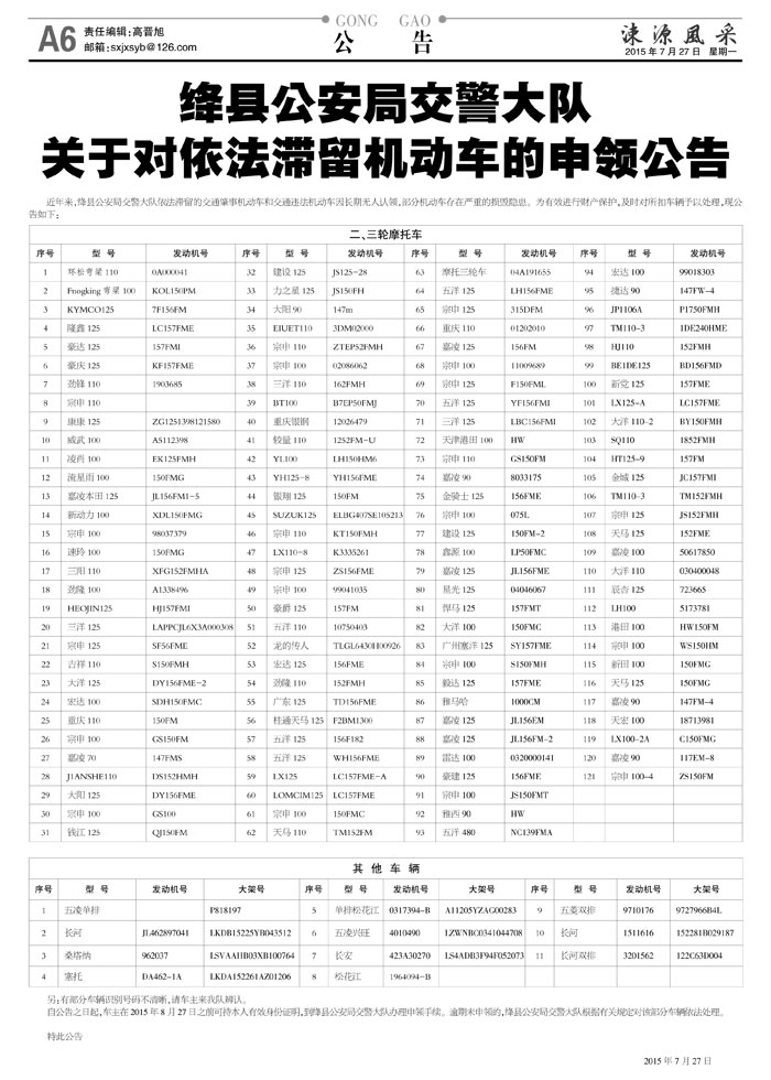绛县公安局交警大队关于对依法滞留机动车的申领公告