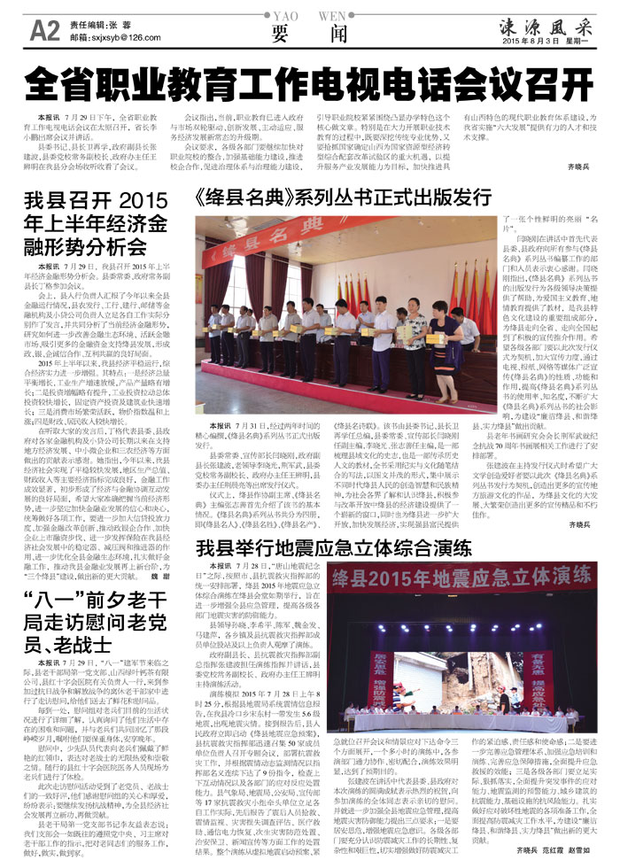 本报讯 7月28日,"唐山地震纪念日"之际,按照市、县抗震救灾指挥部的统一安排部署,绛县2015年地震应急立体综合演练在绛县会堂如期举行,旨在进一步增强全县应急管理,提高各级各部门地震灾害的防御能力。