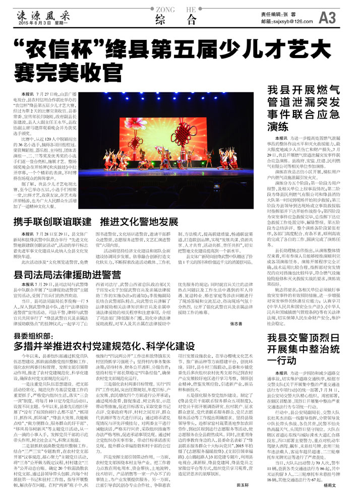 本报讯 7月27日晚,由县广播电视台、县农村信用合作联社举办的"农信杯"绛县第五届少儿才艺大赛,经过为期2天的比赛完美收官。县委常委、宣传部长闫晓刚,政府副县长张建波,县人大副主任王永华,县政协副主席马建萍观看晚会并为获奖选手颁奖。