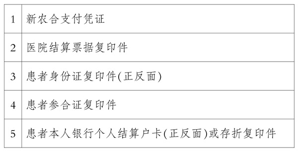 (1)转诊单;(2)合作医疗证;(3)身份证、户口本;(4)本地建行卡;(5)诊断建议书;(6)出院证;(7)住院收费票据(发票);(8)住院费用总清单;(9)病历复印件(病历首页、入院证、出入院记录、长期医嘱、临时医嘱、检验报告单、检查报告单、手术记录、麻醉记录);(10)村委会证明;(11)出生医学证明(新生儿)。