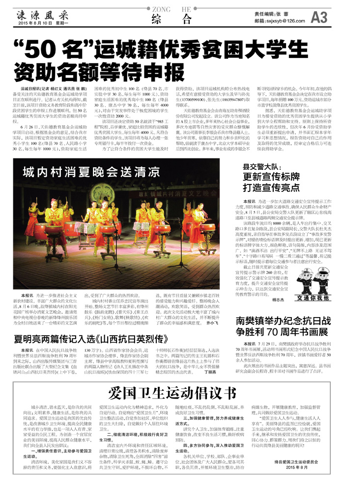 城内村村委主任乔忠民宣布演出开始。整场文艺节目丰富多彩,有绛州鼓乐《鼓韵龙腾》、《普天乐》、《秦王点兵》、《杨门女将》,歌舞《秧歌情》、《欢乐的跳吧》等,每个节目都经过精挑细选,既有节目质量又兼顾乡镇老百姓的接受能力和兴趣爱好。整场晚会人潮涌动,欢歌笑语,受到群众热烈欢迎。此次文化活动极大地丰富了城内村广大群众的文化生活,并不断提升了群众的幸福感和满意度。 乔小飞