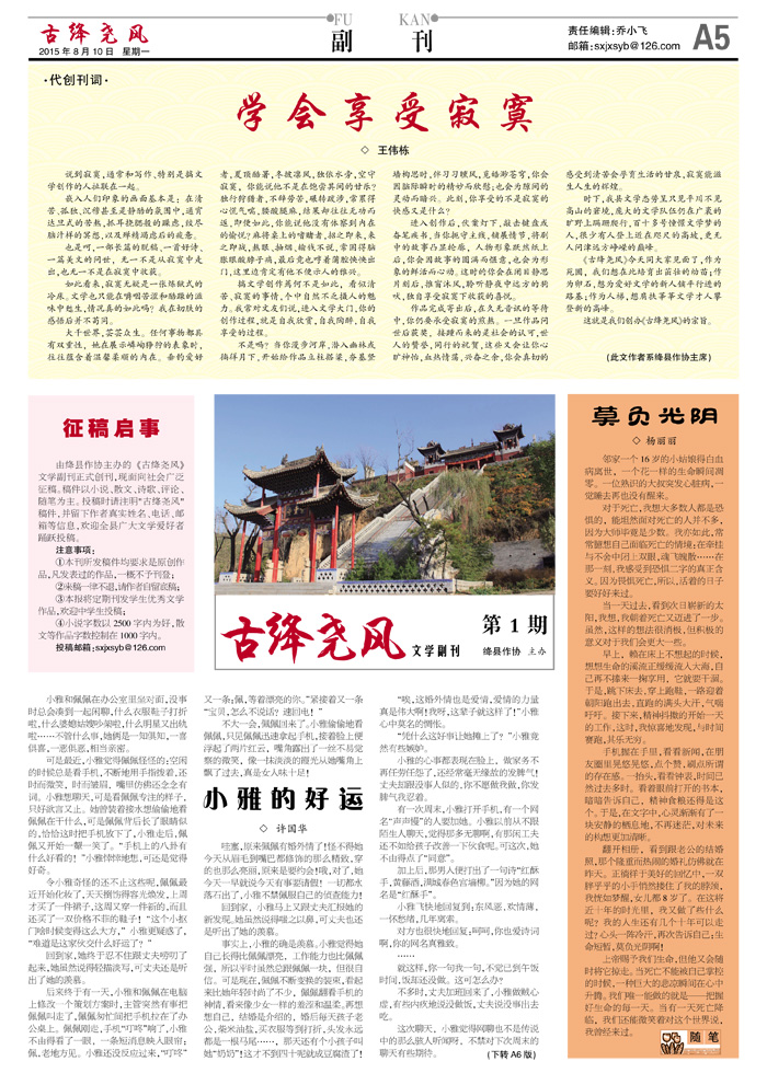 由绛县作协主办的《古绛尧风》文学副刊正式创刊,现面向社会广泛征稿。稿件以小说、散文、诗歌、评论、随笔为主。投稿时请注明"古绛尧风"稿件,并留下作者真实姓名、电话、邮箱等信息,欢迎全县广大文学爱好者踊跃投稿。