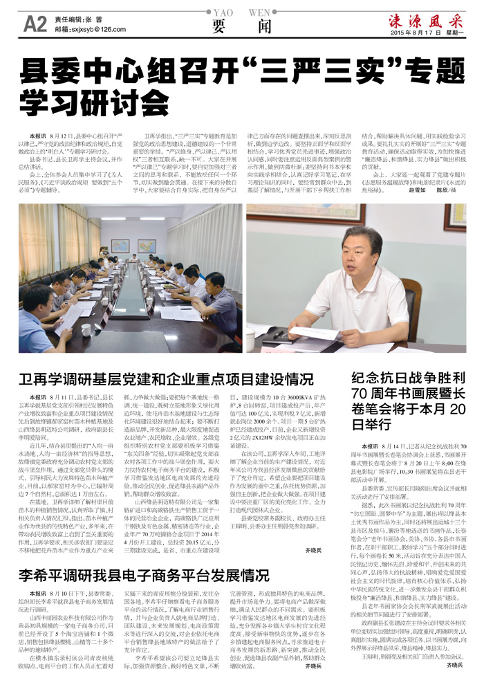 本报讯 8月14日,记者从纪念抗战胜利70周年书画展暨长卷笔会协调会上获悉,书画展开幕式暨长卷笔会将于8月20日上午8:00在绛县电影院广场举行,10:30书画展览将在县老干部活动中开展。