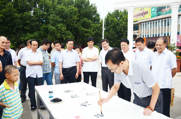 县委常委、宣传部长闫晓刚在讲话中,代表县委、县政府对前来参加书画展暨长卷笔会开幕式的各位领导、各位来宾,特别是来自兄弟县(市)书画艺术家和各大媒体的记者朋友们,表示热烈的欢迎和衷心的感谢!向积极投稿参展和参加长卷笔会的各位领导、各位书画艺术家以及书画爱好者表示热烈的祝贺和衷心的感谢!闫晓刚指出,绛县历史悠久,文化灿烂,是华夏文明重要的发祥地之一,有"天下第一县"之称,是尧帝诞生地,是晋文公成就霸业之处,是西汉名将周勃封地,是西周初年倗国治所,是宋代状元张观和清代探花乔晋芳出生地,拥有10处国保单位和多处名胜古迹,深厚的历史文化积淀为绛县的书画艺术留下了源源不断的创作源泉。近年来,县委、县政府积极打造"尧王故里""晋国古都"文化品牌,努力建设"书画艺术之乡"。相继成立了书法家协会、美术家协会、老年书画家协会,全县十个乡镇都成立了书画分会,村村建起了书画小组和农家书屋,中小学校将书法列入了教学课程。倗国书画院、紫金书画院、绛宝斋等一大批书画机构不断涌现,各种规模的书画笔会、展览、赛事活动异彩纷呈,一大批书画作品在央视书画频道和全国各大媒体及各大赛事上刊播获奖。2013、2014年,先后在运城、太原成功举办了"尧王故里 美丽绛县"书画展和"绛县民间书画展",我县被命名为"山西省老年书画工作先进县"和"运城市书画先进单位"。