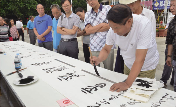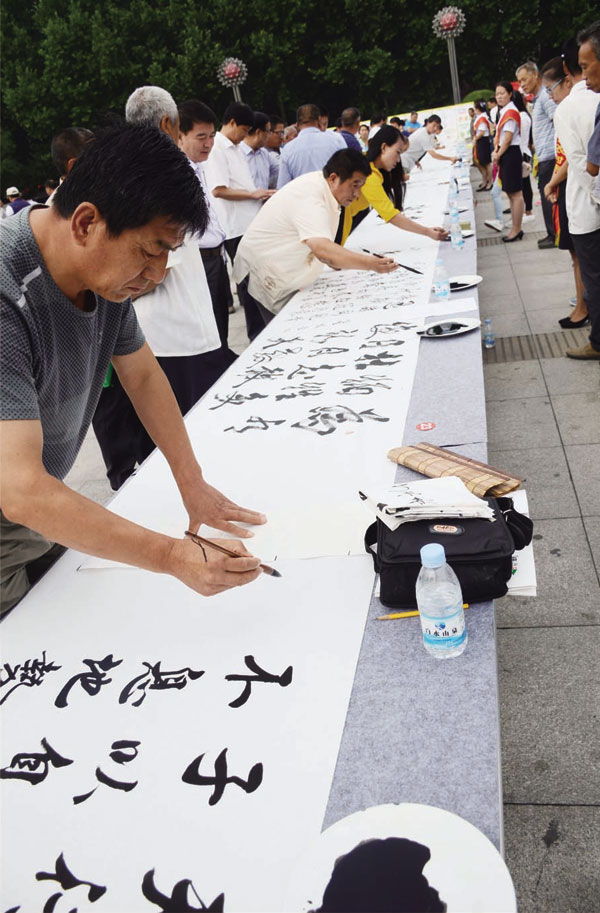 县委常委、统战部长秦志洲宣布纪念抗战胜利70周年书画展暨长卷笔会开幕。