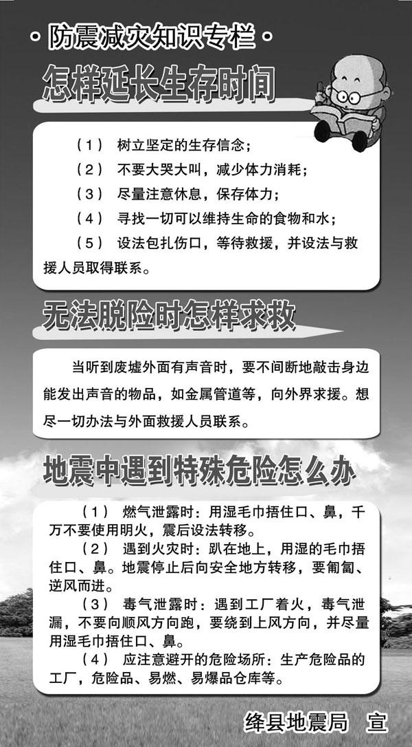 地震中怎样延长生存时间、无法脱险时怎样求救、遇到特殊危险怎么办