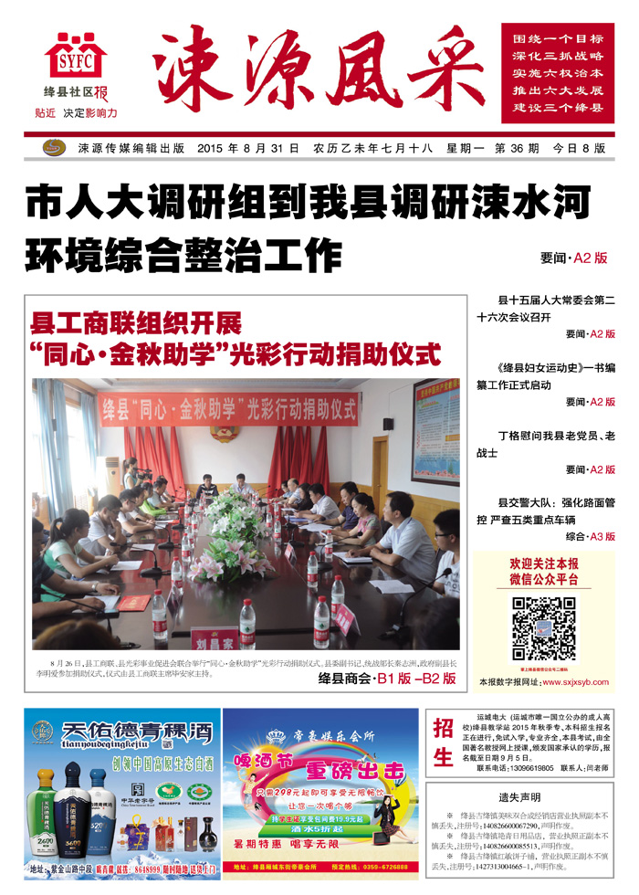 《涑源风采》绛县社区报 贴近,决定影响力 涑源传媒编辑出版 微信:suyuanfengcai 邮箱:sxjxsyb@126.com 电话:6523423