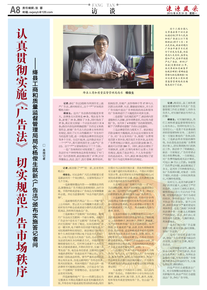 认真贯彻实施《广告法》 切实规范广告市场秩序 ——绛县工商和质量监督管理局局长杨俊生就新《广告法》颁布实施答记者问