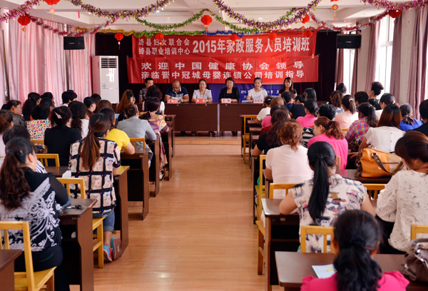 本报讯 8月24日,由县妇联与县人社局职业培训中心联合举办的家政服务人员职业技能培训开班。来自10个乡镇的80余名农村妇女齐聚一堂,共同聆听由"中国健康协会"的优秀讲师卢世春、边雪莲带来的月嫂专业技能培训。