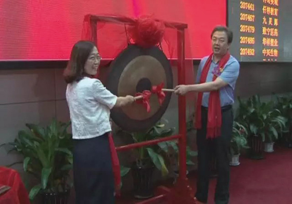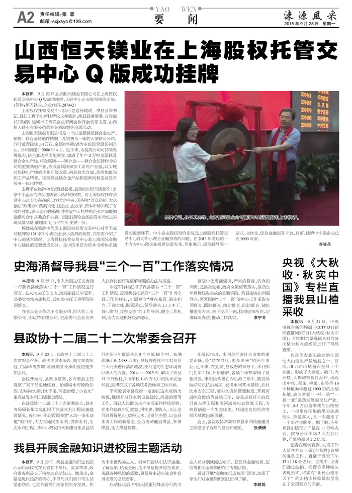 县委书记、县长卫再学,山西恒天镁业公司董事长刘淑娟敲响上市铜锣。