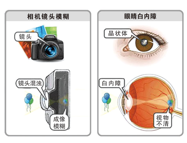 凡是各种原因如老化、遗传、局部营养障碍、免疫与代谢异常、外伤、中毒、辐射等,都能引起晶状体代谢紊乱,导致晶状体蛋白质变性而发生混浊,称为白内障。正如右图所示,就如同照相机的镜头发生混浊而无法拍出清晰的相片一样,当我们的晶体发生混浊就会造成视物不清的现象。随着病情发展混浊部位逐渐增大,最终会遮盖住我们眼睛的整个"镜头"形成失明。