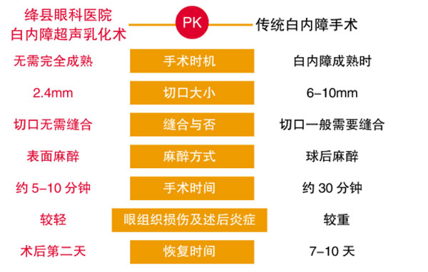 手术是目前治疗白内障唯一有效的方法,通过手术治疗绝大部分患者可恢复到正常视力。白内障超声乳化术+人工晶体植入是目前治疗白内障主流方法,而冷超乳技术则是对超声乳化述的进一步发展,能减少术中灼热,使手术损伤更小,术后反应更轻,恢复更快。