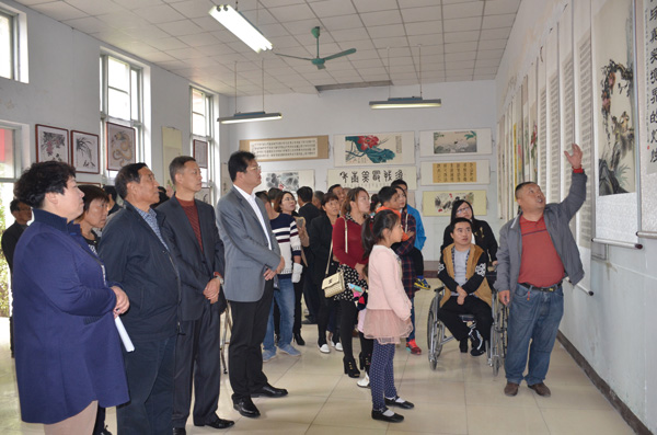 书画展共展出万二春口书、口画作品63幅,从他十年来创作的1000多幅书画作品中精选出来,既有花草虫鱼山水画、又有工整流畅的篆书作品,书画展吸引了众多群众前来观看。