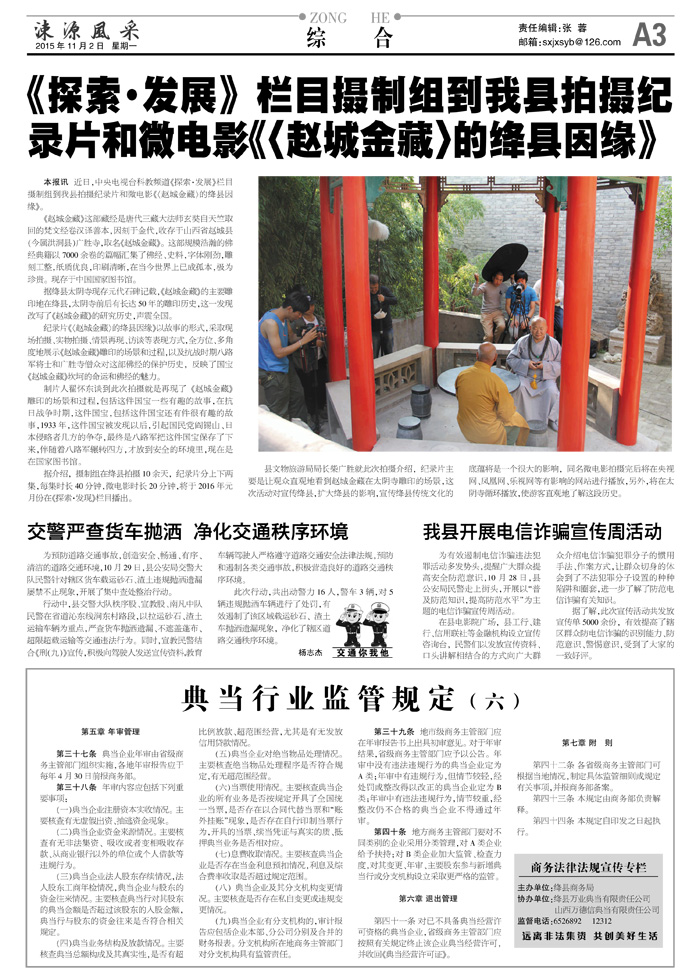 本报讯 近日,中央电视台科教频道《探索·发展》栏目摄制组到我县拍摄纪录片和微电影《〈赵城金藏〉的绛县因缘》。